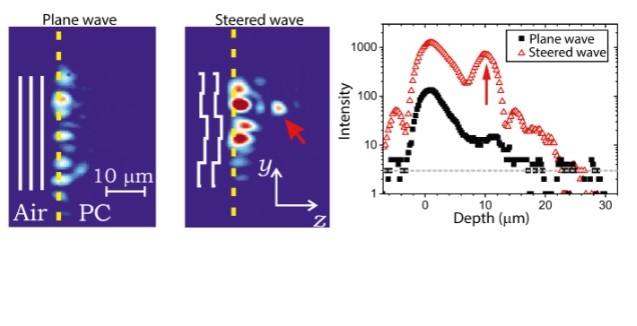 Right: By shaping the incident waves, one steers the waves deep into the crystal, thereby enabling the focusing of light at any desirable depth inside the otherwise forbidden gap.